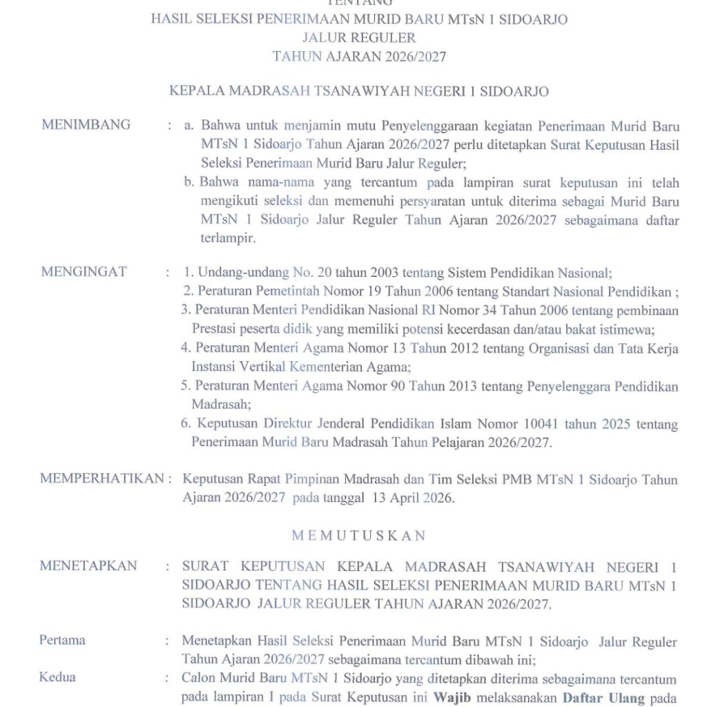 SK Hasil Seleksi PMBM Jalur Reguler MTsN 1 Sidoarjo TA 2026/2027 -