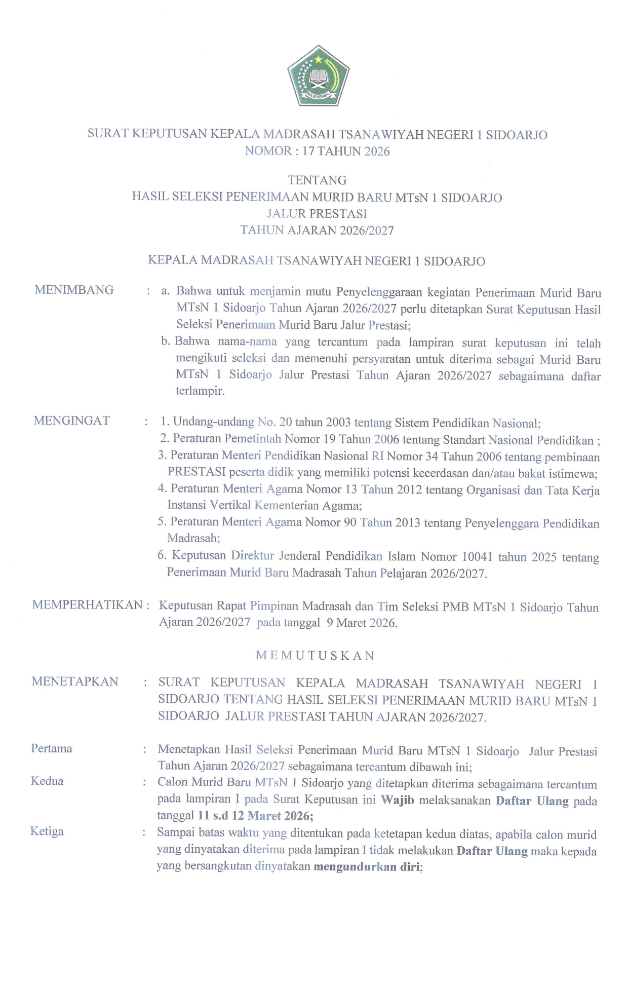 SK Hasil Seleksi PMBM Jalur Reguler MTsN 1 Sidoarjo TA 2026/2027 13 April, 2026 by Tim Konten Kreator InformasiPPDB Berikut SK Hasil Seleksi PMBM Jalur Reguler MTsN 1 Sidoarjo : Lampiran SK lihat disini !