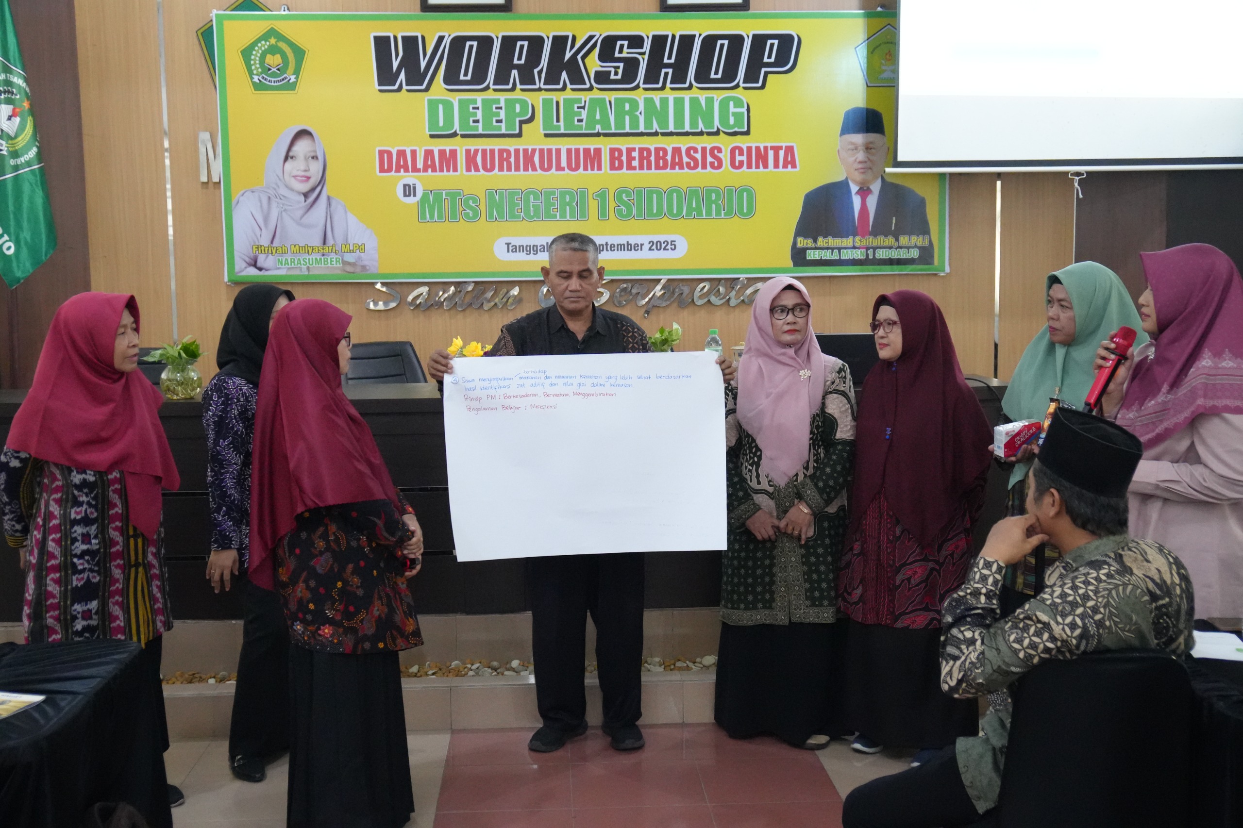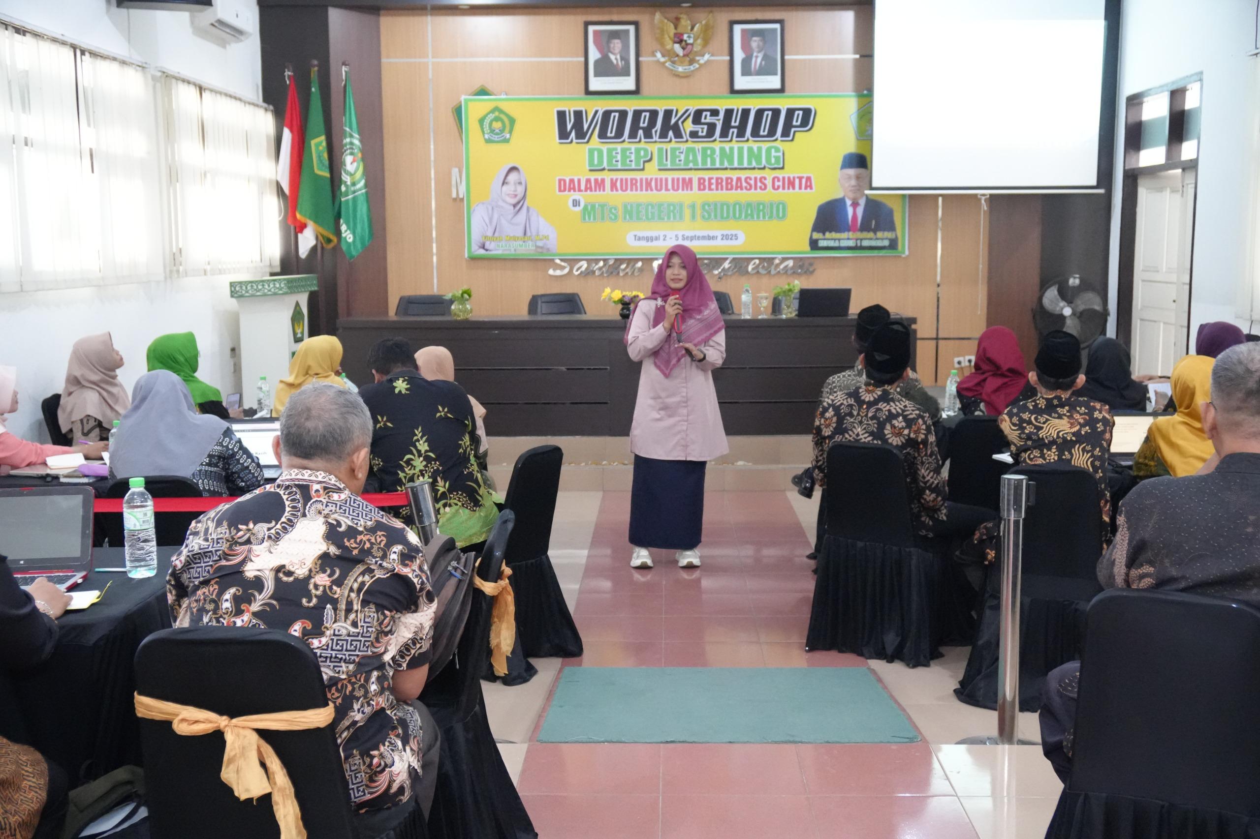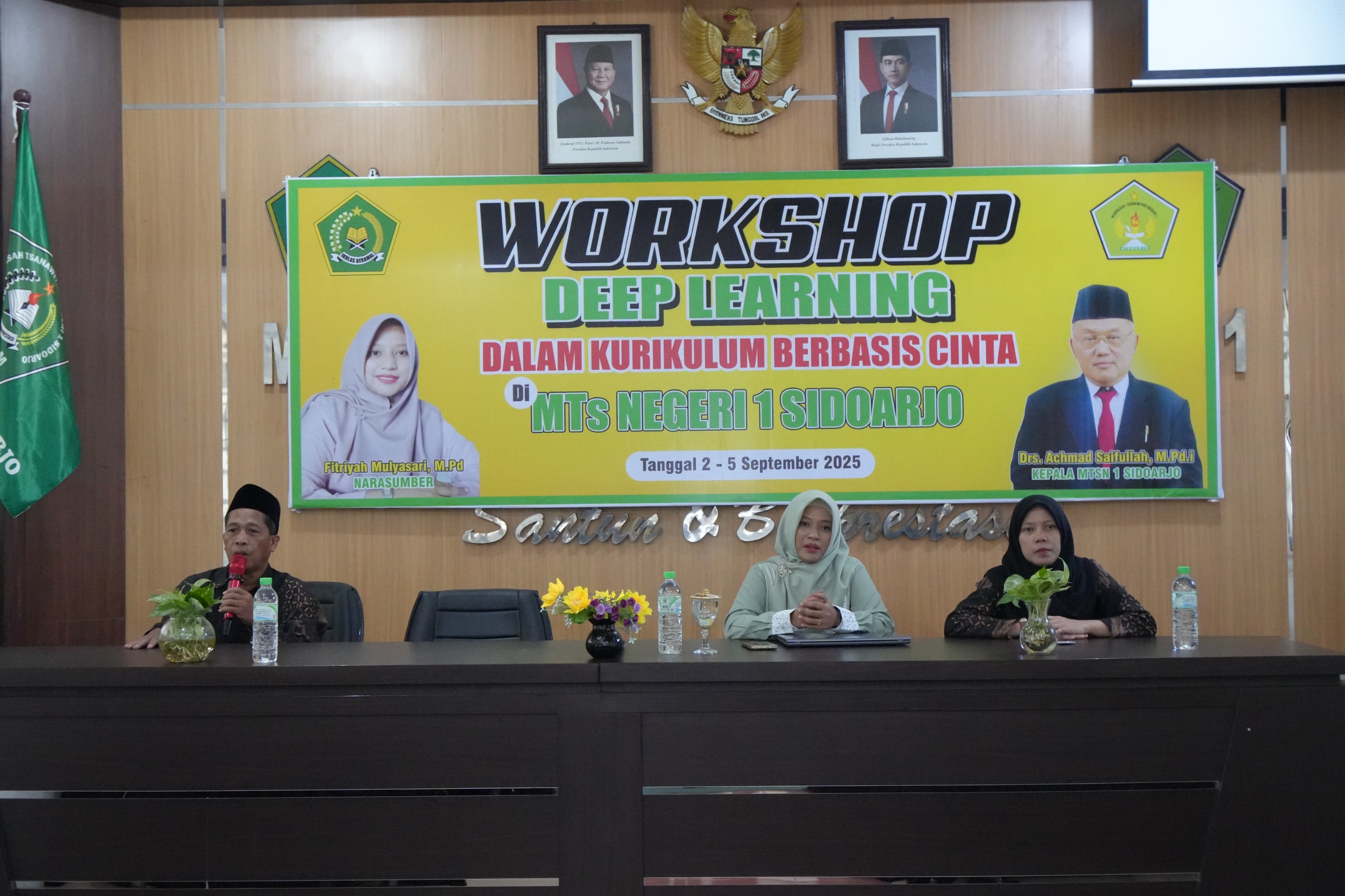 Sidoarjo (05-09-2025) ❤️ — Dalam upaya menciptakan metode pembelajaran yang inovatif, bermakna, dan dekat dengan siswa, MTs Negeri 1 Sidoarjo menyelenggarakan kegiatan Workshop Deep Learning dalam Kurikulum Berbasis Cinta yang dilaksanakan pada tanggal 02 s.d. 05 September 2025, dengan narasumber Ibu Fitriyah Mulyasari, M.Pd.